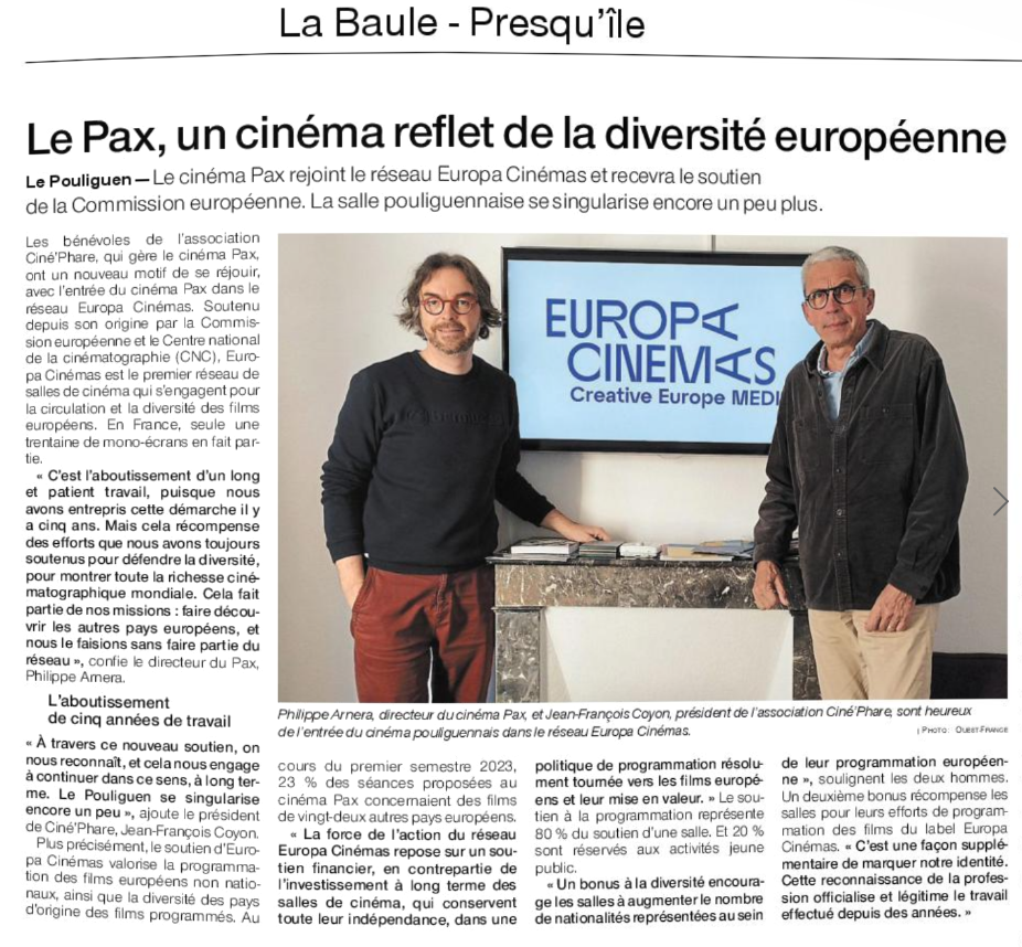 Nous sommes très heureux d’annoncer que le cinéma Pax rejoint le réseau Europa Cinemas pour l’année 2023 ! Soutenu depuis son origine par la Commission européenne et le CNC, Europa Cinemas est le premier réseau de salles de cinéma qui s’engagent pour la circulation et la diversité des films européens. 3060 écrans, 38 pays, 744 villes …dont Le Pouliguen désormais. En France, seule une trentaine de mono-écrans en est. Reconnaissance.